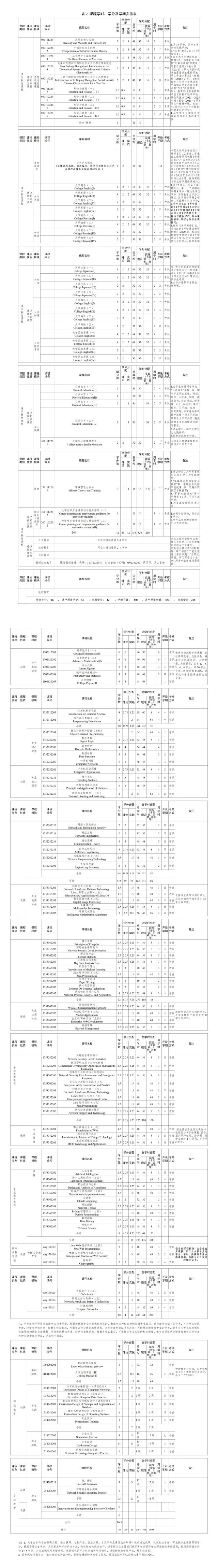 主要课程:高等数学、线性代数、概率论与数理统计、计算机科学导论、程序设计基础(上机)、大学物理、面向对象程序设计(上机)、数字逻辑、离散数学、计算机组成原理、路由与交换技术、数据结构、操作系统、数据库原理与应用、网络与信息安全、计算机网络、网络工程、通信原理、网络编程技术、工程经济学等。