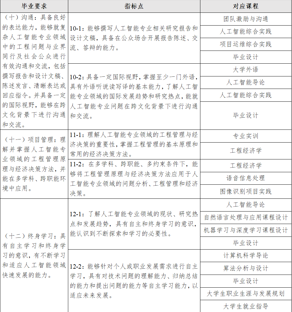 10-2:具备一定国际视野,掌握至少一门外语,具有外语听说读写译的基本能力,了解人工智能专业领域的国际发展趋势和研究热点,能就人工智能专业问题在跨文化背景下进行沟通和交流。