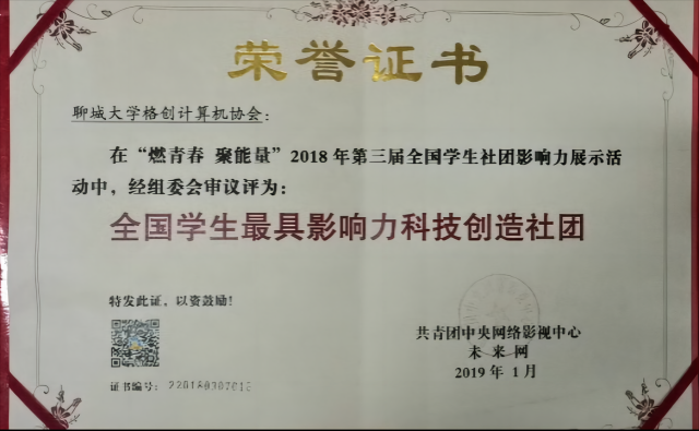 近五年来,格创计算机协会曾在“燃青春 聚能量”第三届全国学生社团影响力展示活动中被评为“全国学生最具影响力科技创造社团”,在聊城大学2020年度共青团先优评选表彰中被评为“大学生社团工作先进集体”,成功立项“聊城大学2022年度十佳团支部”。