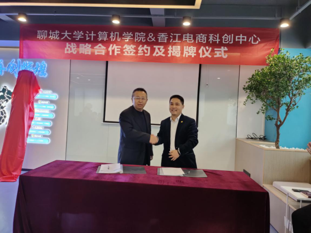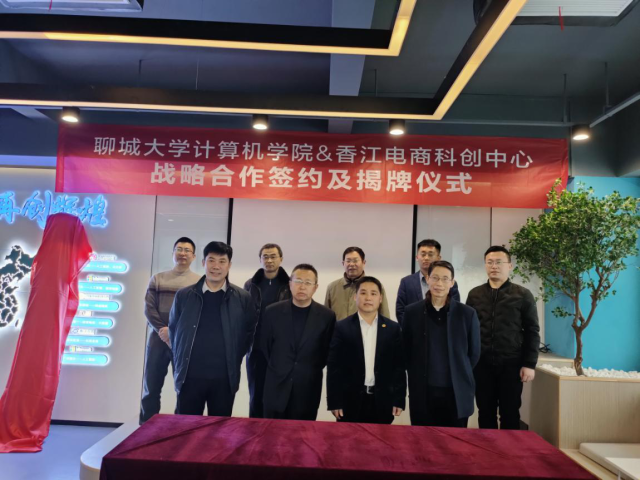 活动伊始,高忠峰就疫情以来对电商行业带来的契机,他表示,商贸转型形势急迫,签约聊城大学人才培养战略的重要合作定能为香江商贸发展输入关键人才,带动香江市场再度繁荣。孟晗上台致辞:“计算机学院肩负着为企业与地方培养、输送人才的重任,今日与香江电商科创中心的签约合作,不仅是‘校企合作’模式的一次践行,更是为人才的孵化与培养提供了沃土,为电商经济的发展提供充足的人才支持,从而带动青年创业热情,促进城市电商经济的良性发展。随后,董海峰上台发言,表达了对通过合作打通学校与企业之间的交流通道的信心,以及对实现企业、学校、社会三方共赢,振兴区域经济,实现商贸升级的期盼。最后,孟晗与董海峰共同上台签署《战略合作协议》,开展基地成立揭牌仪式。