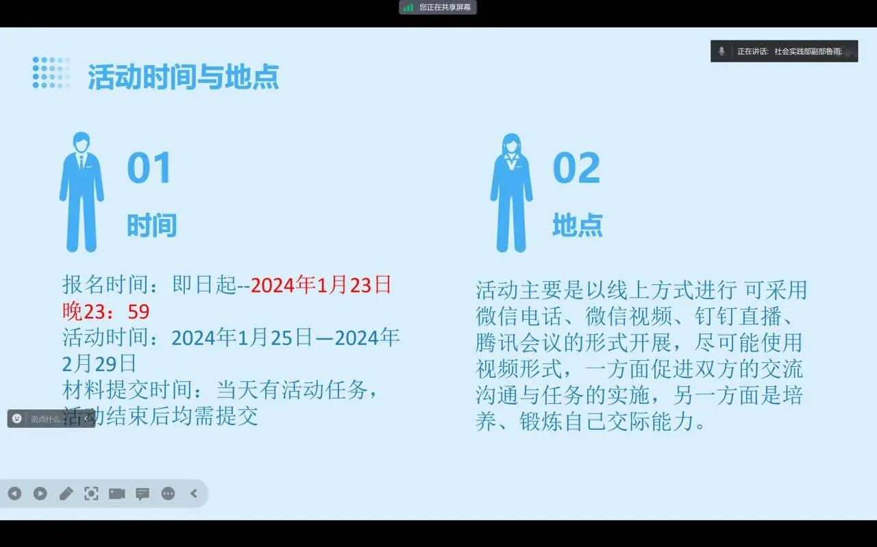 为了让志愿者们更快地熟悉活动内容和流程,鲁雨对全国大学生2024寒假“返家乡”社会实践“一起云支教”专项活动进行详细说明,主要分为活动简介和要求两方面。她通过活动的不同板块详细地介绍了志愿者的任务与职责,以及活动的实施方案与内容,并对同学们提出的相关问题答疑解惑。随后,主讲人说明了活动的要求,除对志愿者做出了基本要求以外,对学生个人信息的保密方面也做了强调,让志愿者们对活动内容和要求有了更深入的理解和认识。最后,鲁雨介绍了不同活动板块的志愿者时长占比情况,并呼吁同学们要以饱满的热情和专业的态度投入到志愿服务中,尽己所能的为社会献出一份力量。