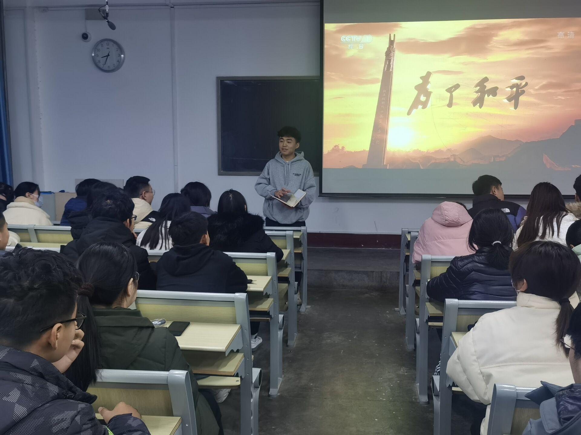 活动伊始,团委委员王其鲁先指出了本次活动的意义并就《为了和平》的剧情做了简单介绍,要求大家认真观看影片,学习其中的精神价值。该片共6集,采取史论结合、故事表达的方式,回顾呈现中国共产党领导抗美援朝战争的光辉历程和宝贵经验,全面反映抗美援朝战争的正义性质和伟大胜利,深入反映伟大的抗美援朝精神的丰富内涵和时代价值,集中展示中国人民志愿军的英雄事迹和革命精神,生动展现全国各族人民同仇敌忾、众志成城的大力支援和家国情怀,充分彰显中华民族不畏强暴、维护和平的坚定决心和巨大贡献。影片播放完毕,同学们百感交集、心潮澎湃,感受到了作为新时代青年的使命与担当,坚定了砥砺奋斗的远大理想。“对历史最好的纪念,就是创造新的历史。”同学们表示今后一定会牢记初心使命,坚定必胜信念,发扬斗争精神,增强斗争本领,为实现中华民族伟大复兴的中国梦作出更大贡献。