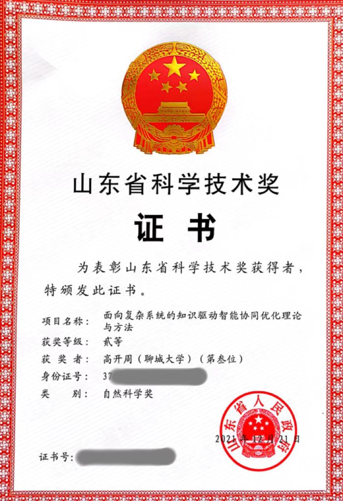 近日,山东省人民政府公布了《关于2021年度山东省科学技术奖励的决定》。我院智能优化算法及其应用团队成员高开周老师参与的“面向复杂系统的知识驱动智能协同优化理论与方法”项目成果获得山东省自然科学奖二等奖。