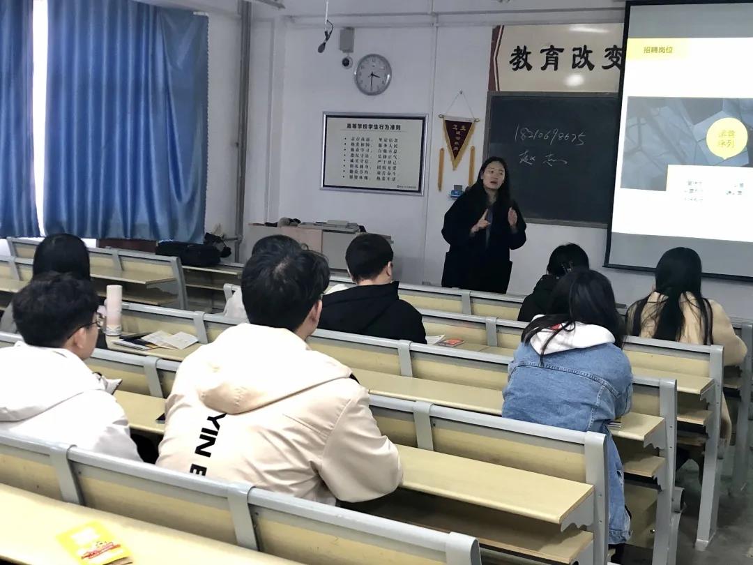 本次招聘会的主讲人为课观教育集团校园招聘部经理赵志、金融运营四部经理暨东北地区负责人刘娟。赵志为大家介绍了课观教育集团的公司概况,他讲到:“课观教育集团拥有教研力量和技术团队,倡导“高效学习,快速成长”的学习理念,致力于以科技提升用户体验和学习效率,用互联网+来打破优秀教师地域分布不平衡的现状。”同时,他也就大家最为关注的薪酬待遇、补贴福利等问题做出详细解答。同学们与老师积极互动,活动氛围融洽。随后,刘娟结合自身就业经验,向同学们提出宝贵建议。她表示,要按照职业的标准化、规范化、制度化要求自己,在细节之处做得专业,用理性的态度对待工作,保持自己的敬业态度。在“有问必答”环节,同学们积极提出问题,两位老师也耐心进行了现场答疑,并告知同学们详细的招聘地点、招聘需求等信息,热情地欢迎同学们参加下一步的面试。